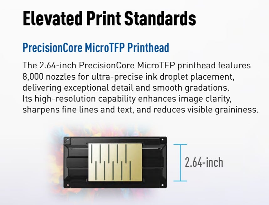 2. หัวพิมพ์ PrecisionCore® MicroTFP®: เทคโนโลยีหัวพิมพ์ขั้นสูงของเอปสัน ด้วยหัวฉีดถึง 8,000 หัว (800 หัว x 10 สี) และความละเอียดสูงสุด 2400 x 1200 dpi ทำให้มั่นใจได้ในผลงานที่คมชัดทุกรายละเอียด แม้ในงานพิมพ์ขนาดใหญ่
