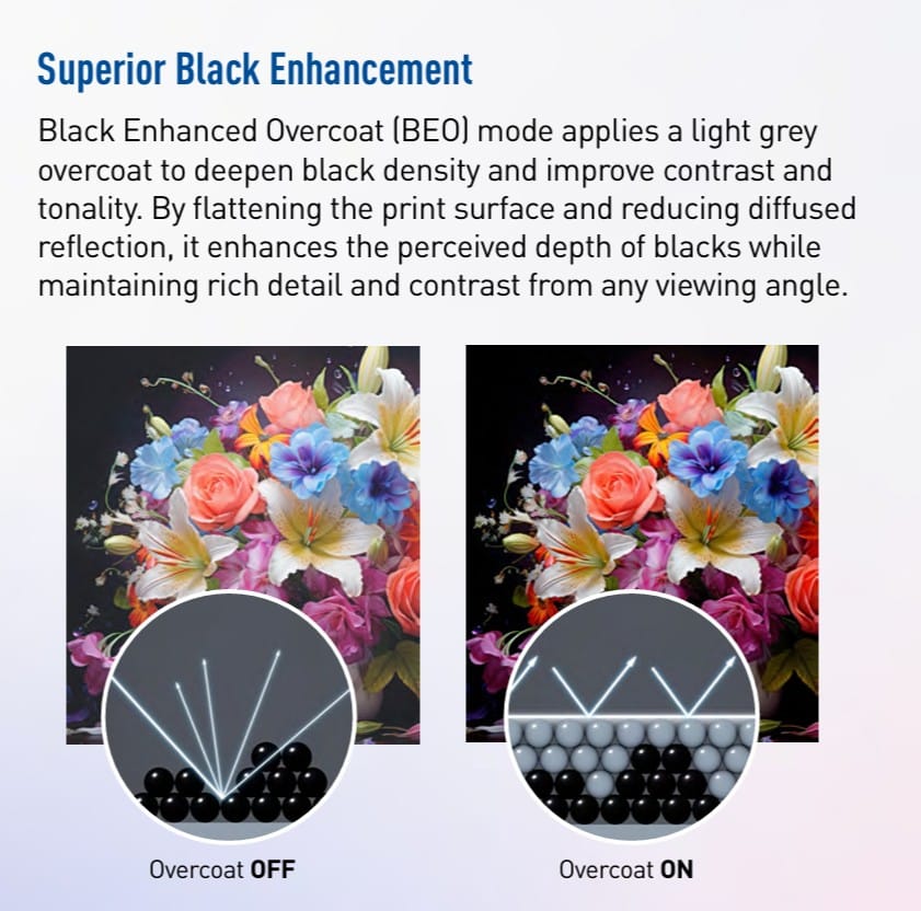 1. ระบบหมึก 10 สี UltraChrome® PRO10 พร้อมหมึกสีม่วง หัวใจหลักที่สร้างความแตกต่างคือชุดหมึก 10 สี ที่มี หมึกสีม่วง (Violet) ช่วยขยายขอบเขตสีให้กว้างยิ่งขึ้น โดยเฉพาะโทนสีน้ำเงินและม่วง ทำให้ได้ผลงานที่มีสีสันสดใส สมจริง และไล่โทนสีได้อย่างนุ่มนวลที่สุด