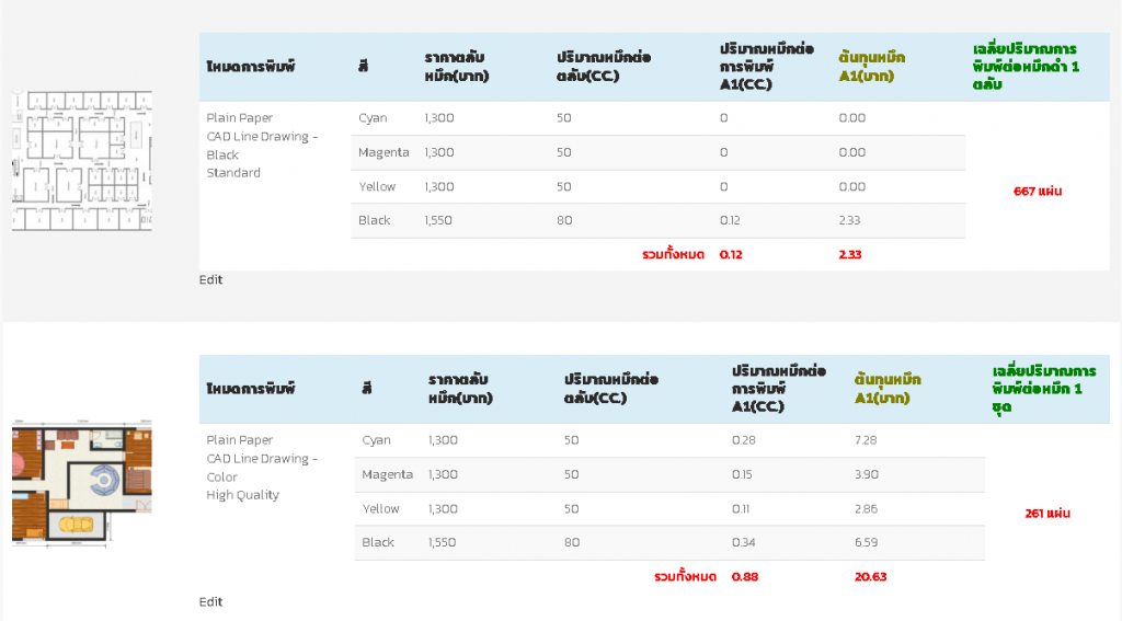 - พิมพ์งานแต่ละเเบบ มีต้นทุนการพิมพ์ เท่าไร เช่น Plain Paper CAD Line Drawing – BlackStandard / Color High Quality / GIS – Color – Black High Quality / Semigloss Photo Paper Poster(Photo)/Perspective High Quality