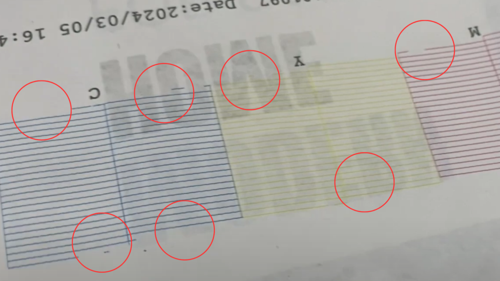 - ตรวจสอบรูปแบบที่พิมพ์ออกมาเพื่อหาเส้นขาดหรือจุดหายไป