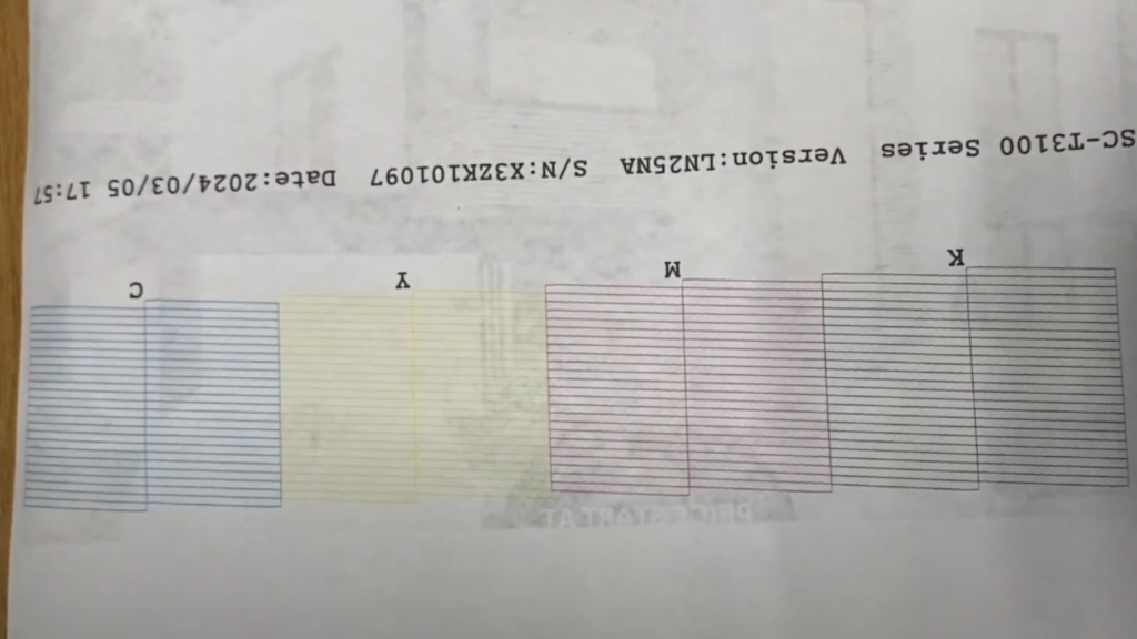 2. เครื่อง Epson SC-T3130X Nozzle Check ไม่ออกเลย ดูยังไงก็น่าจะตัน Clean print head ก็ไม่มีสีไหนออกมาเลย C M Y BK กระดาษขาวเลย ผมก็เตรียมตัว เบิก MB และหมึก เตรียม Power Clean แล้ว เตรียมใจไว้ว่าถ้าไม่หาย ต้องเปลี่ยนหัวพิมพ์แน่ๆ
