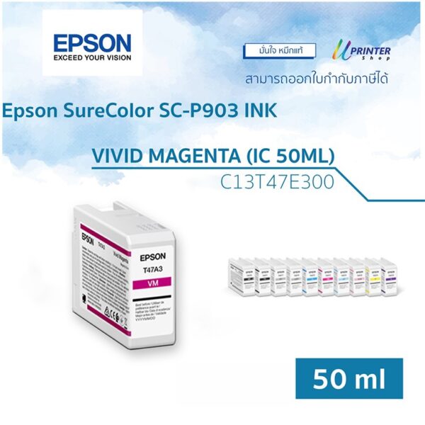EPSON หมึกตลับรหัส C13T47E300 VIVID MAGENTA (IC 50ML) หมึกแท้ สำหรับเครื่องพิมพ์รุ่น Epson SureColor SC-P903 เป็นหมึก UltraChrome Pro10 ให้ช่วงสีดำที่เข้มและลึกที่สุด โทนสีกว้างขึ้น