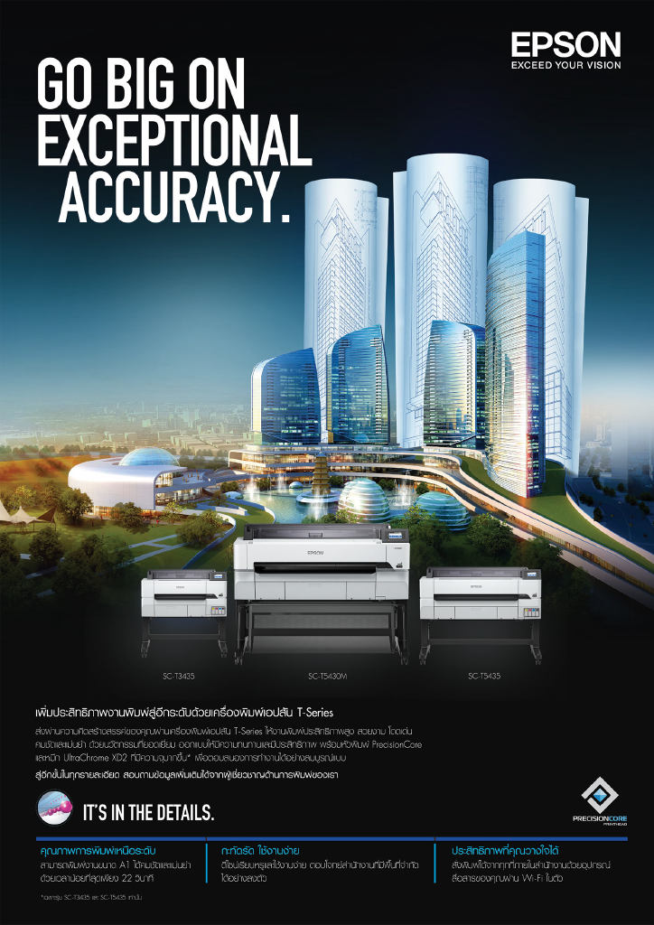 เครื่องพิมพ์เอปสัน T-Series ให้ภาพคมชัด แม่นยำในทุกรายละเอียด มอบงานพิมพ์ที่มีประสิทธิภาพ ด้วยหัวพิมพ์ PresicionCore ที่ทันสมัยและหมึก UltraChrome XD2 แบบใหม่ ให้งานพิมพ์สีสันสดใส คมชัดแม่นยำ ทนทาน ด้วยความเร็วในการพิมพ์ที่เหนือกว่า สร้างความประทับใจให้กับลูกค้า ด้วยงานพิมพ์ที่รวดเร็ว และมีประสิทธิภาพ