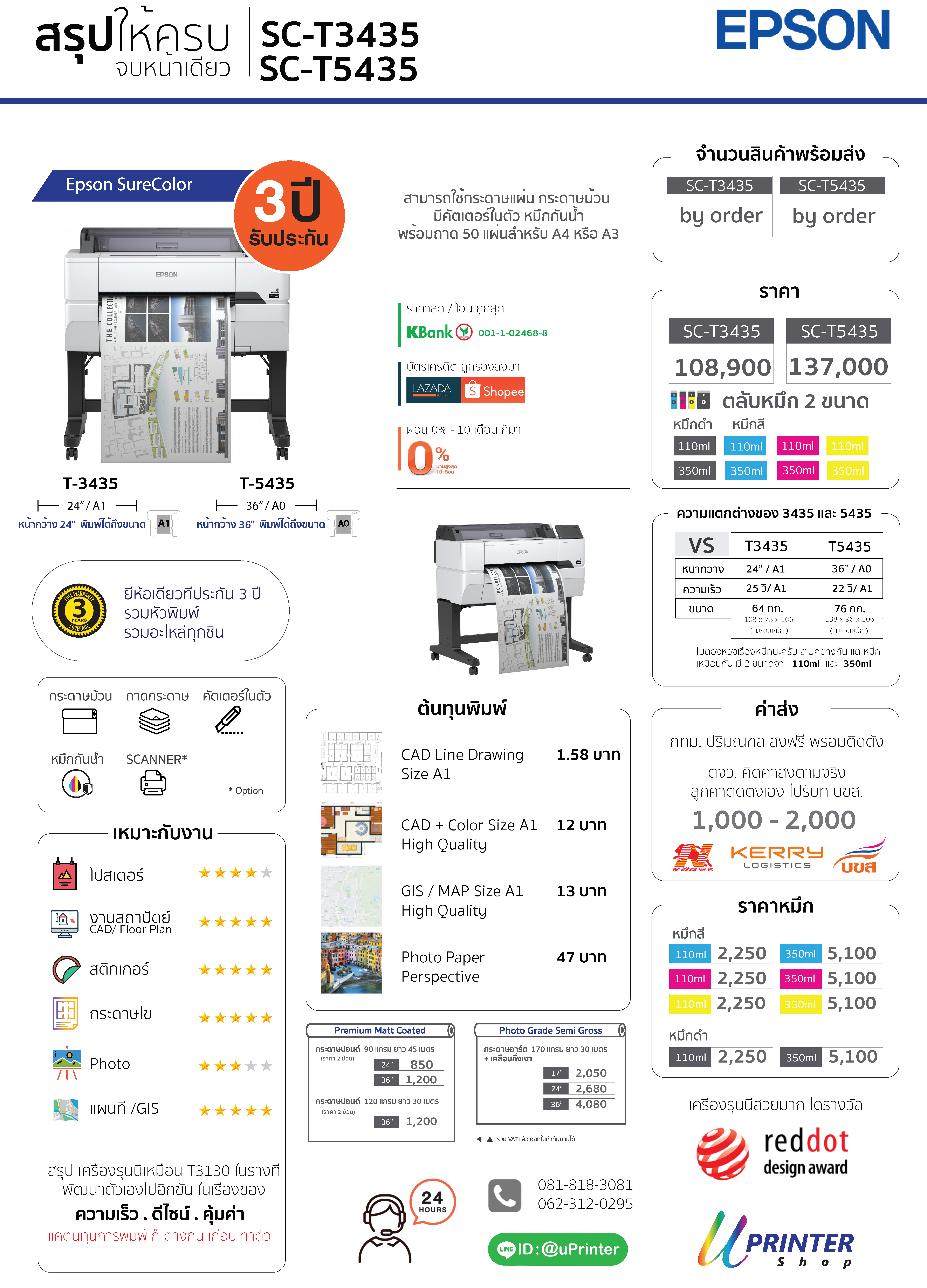 เครื่องพิมพ์เอปสัน SC-T3435 มาพร้อมเทคโนโลยีหัวพิมพ์ PrecisionCore ที่ทันสมัย คงทน ให้อายุการใช้งานที่ยาวนาน ให้งานพิมพ์ที่รวดเร็ว คมชัด คุณภาพสูงและน่าเชื่อถือ สามารถพิมพ์งานขนาด A1 ด้วยเวลาเพียง 22 วินาที*